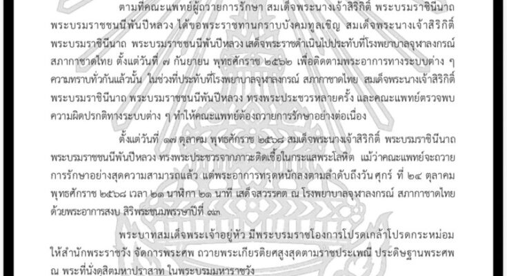 ตามที่คณะแพทย์ผู้ถวายการรักษา สมเด็จพระนางเจ้าสิริกิต์ พระบรมราชินีนาถ พระบรมราชชนนี้พันปีหลวง ได้ขอพระราชทานกราบบังคมทูลเชิญ สมเด็จพระนางเจ้าสิริกิติ์พระบรมราชินีนาถ พระบรมราชชนนีพันปีหลวง เสด็จพระราชดำเนินไปประทับที่โรงพยาบาลจุฬาลงกรณ์ สภากาชาดไทย ตั้งแต่วันที่ ๗ กันยายน พุทธศักราช ๒๕๖๒ เพื่อติดตามพระอาการทางระบบต่าง ๆ ความทราบทั่วกันแล้วนั้น ในช่วงที่ประทับที่โรงพยาบาลจุฬาลงกรณ์ สภากาชาดไทย สมเด็จพระนางเจ้าสิริกิติ์พระบรมราชินีนาถ พระบรมราชชนนีพันปีหลวง ทรงพระประชวรหลายครั้ง และคณะแพทย์ตรวจพบความผิดปรกติทางระบบต่าง ๆ ทำให้คณะแพทย์ต้องถวายการรักษาอย่างต่อเนื่อง