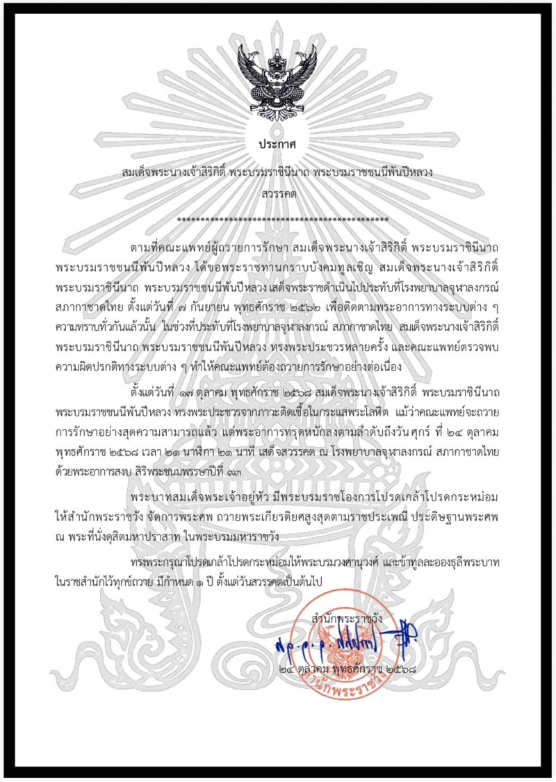 สำนักพระราชวัง เผยแพร่ประกาศ สมเด็จพระนางเจ้าสิริกิติ์ พระบรมราชินีนาถ พระบรมราชชนนีพันปีหลวง สวรรคต